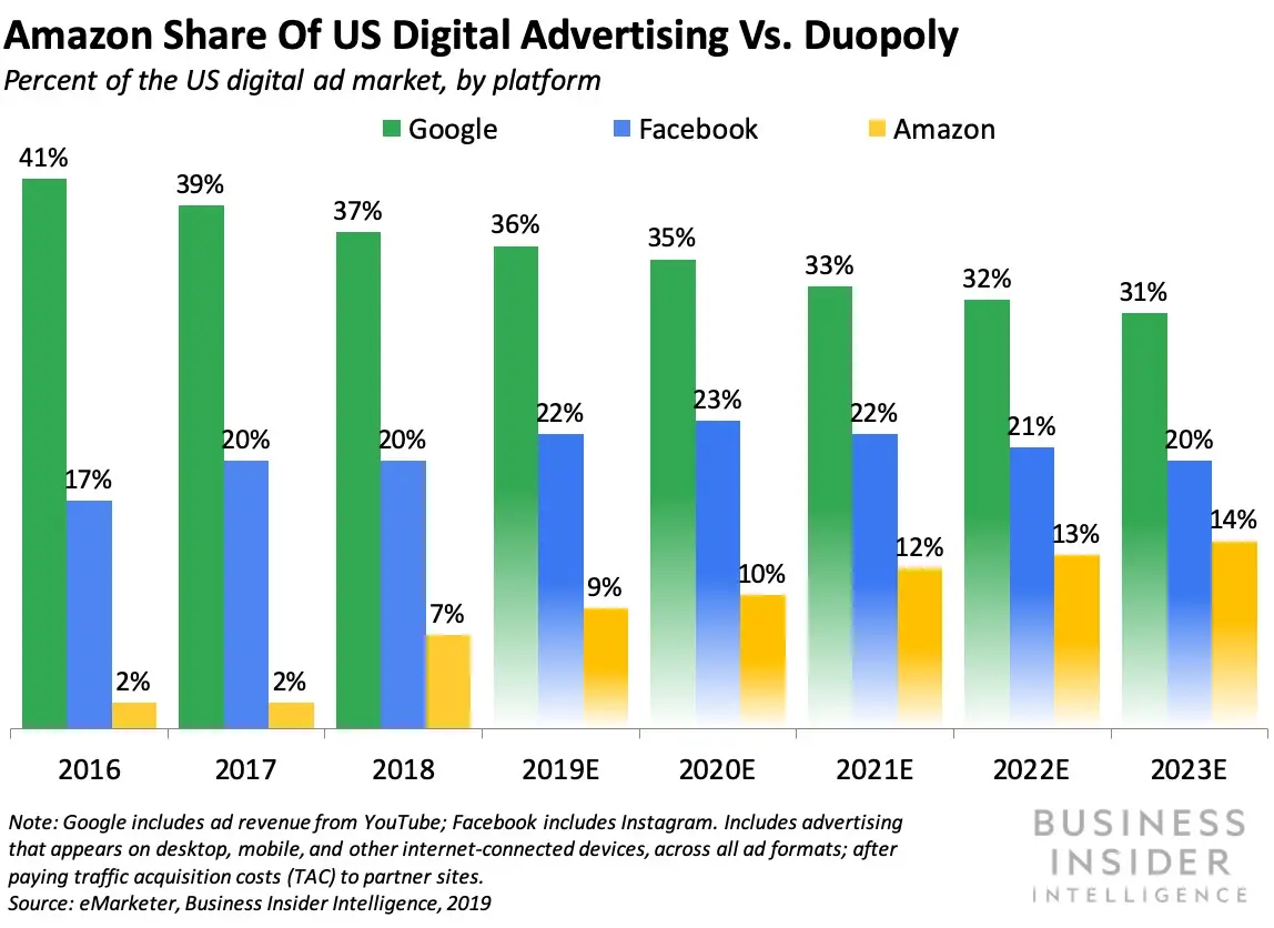 Amazon's market share of US digital advertising is slowly but steadily increasing from 2016 onwards as seen from the above graph by business insider. The duopoly of Google and Meta is breaking apart slowly and the biggest loser among them is Google.